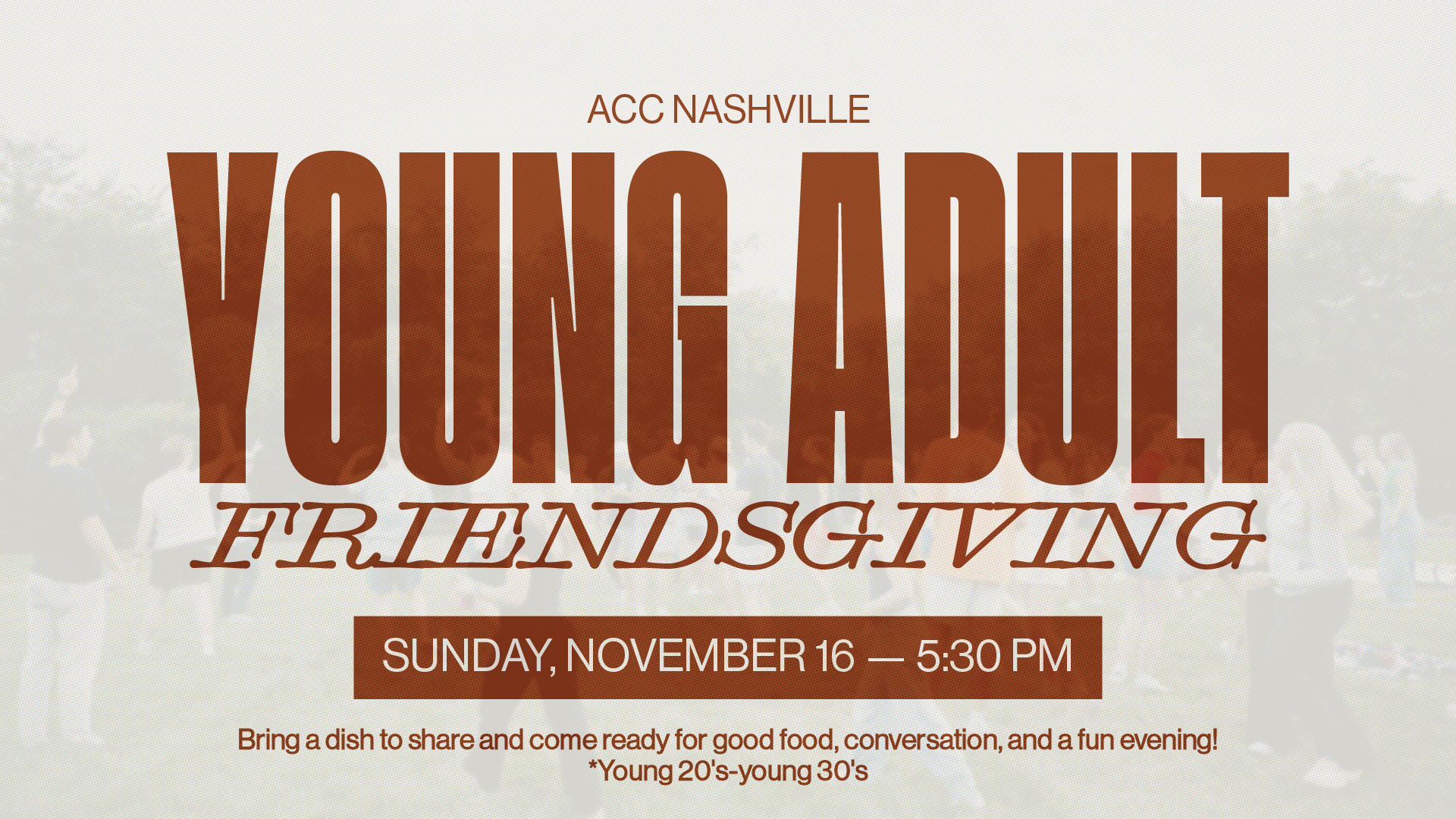 We’re SO pumped for our ACC Nashville Young Adults FRIENDSGIVING! If you’re in your 20s or 30s, come join us as we gather around the table to share a meal and worship together. It’s POTLUCK style! Sign up to bring your favorite Thanksgiving dish (or two)!